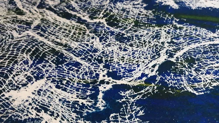 Com o manuseio dos recortes de papel e das tintas transparentes opacas fui obtendo minhas tiragens únicas (1/1). Sugerindo movimentos, relevos e texturas ao quais acrescentei o uso de pinceladas livres sobre o nylon que substituíam o uso de matrizes espontâneas em algumas das etapas da tiragem da peça única.